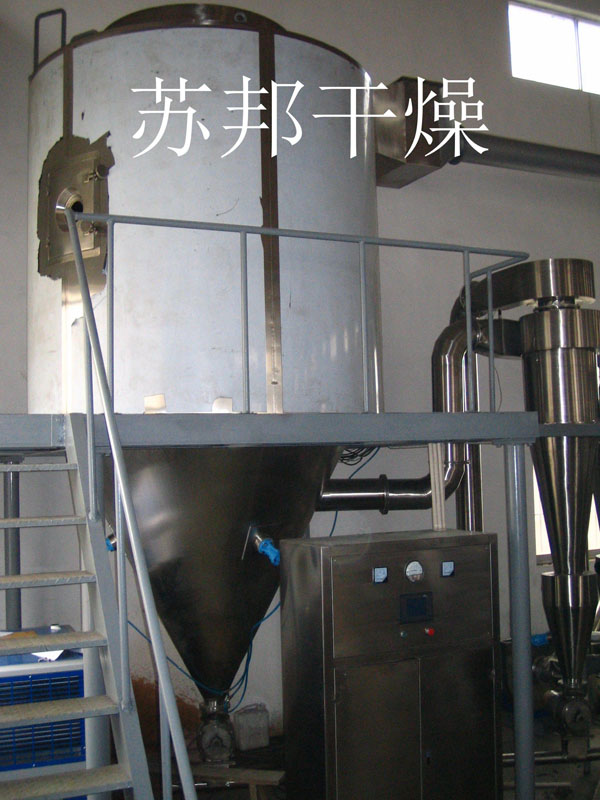 空氣經(jīng)過(guò)濾和加熱,進(jìn)入干燥器頂部空氣分配器,熱空氣呈螺旋狀均勻地進(jìn)入干燥室。料液經(jīng)塔體頂部的高速離心霧化器,(旋轉(zhuǎn))噴霧成極細(xì)微的霧狀液珠,與熱空氣并流接觸在極短的時(shí)間內(nèi)可干燥為成品。成品連續(xù)地由干燥塔底部和旋風(fēng)分離器中輸出,廢氣由風(fēng)機(jī)排空。